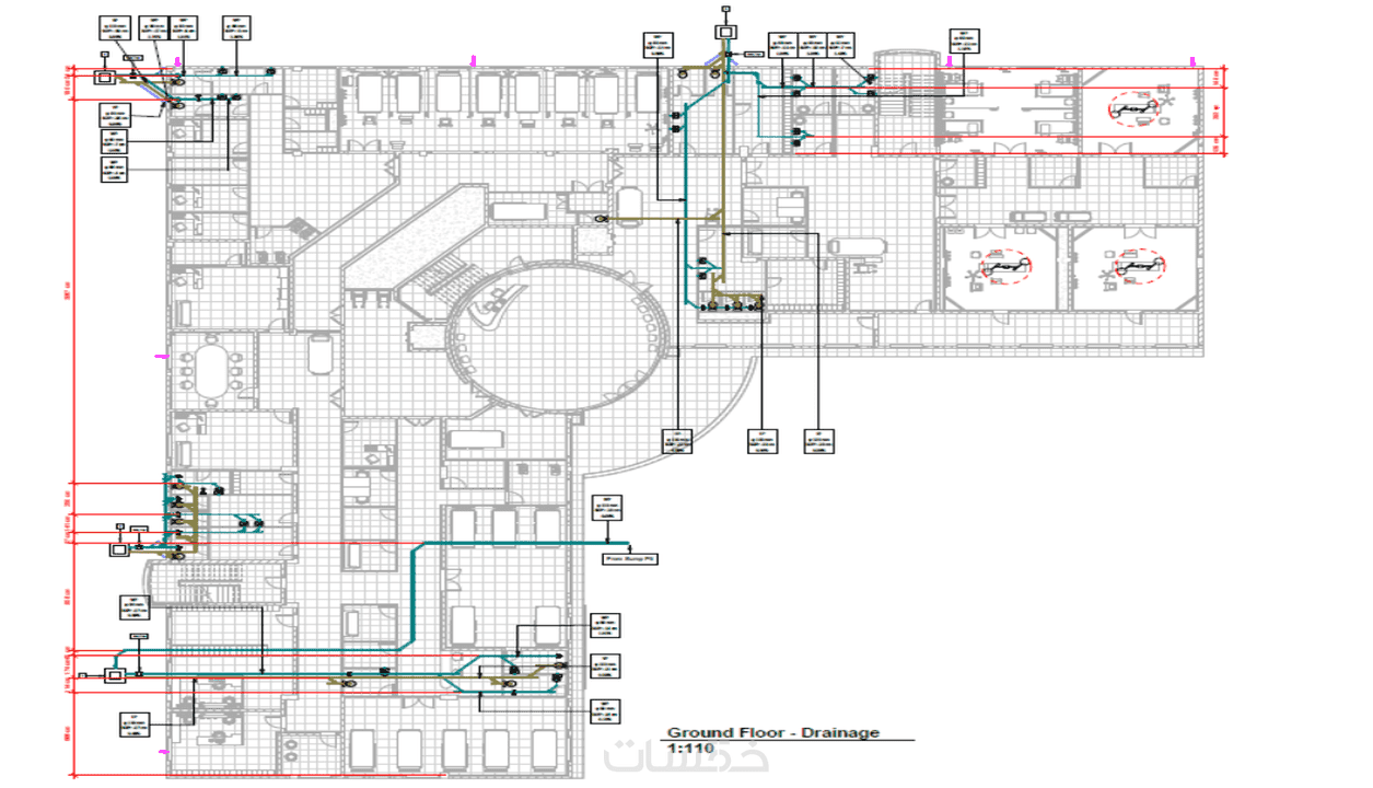 3. تحديد المسار: وضع الأنابيب في المواقع المحددة في المخطط مع مراعاة أبعاد المسارات وارتفاعات التصريف.